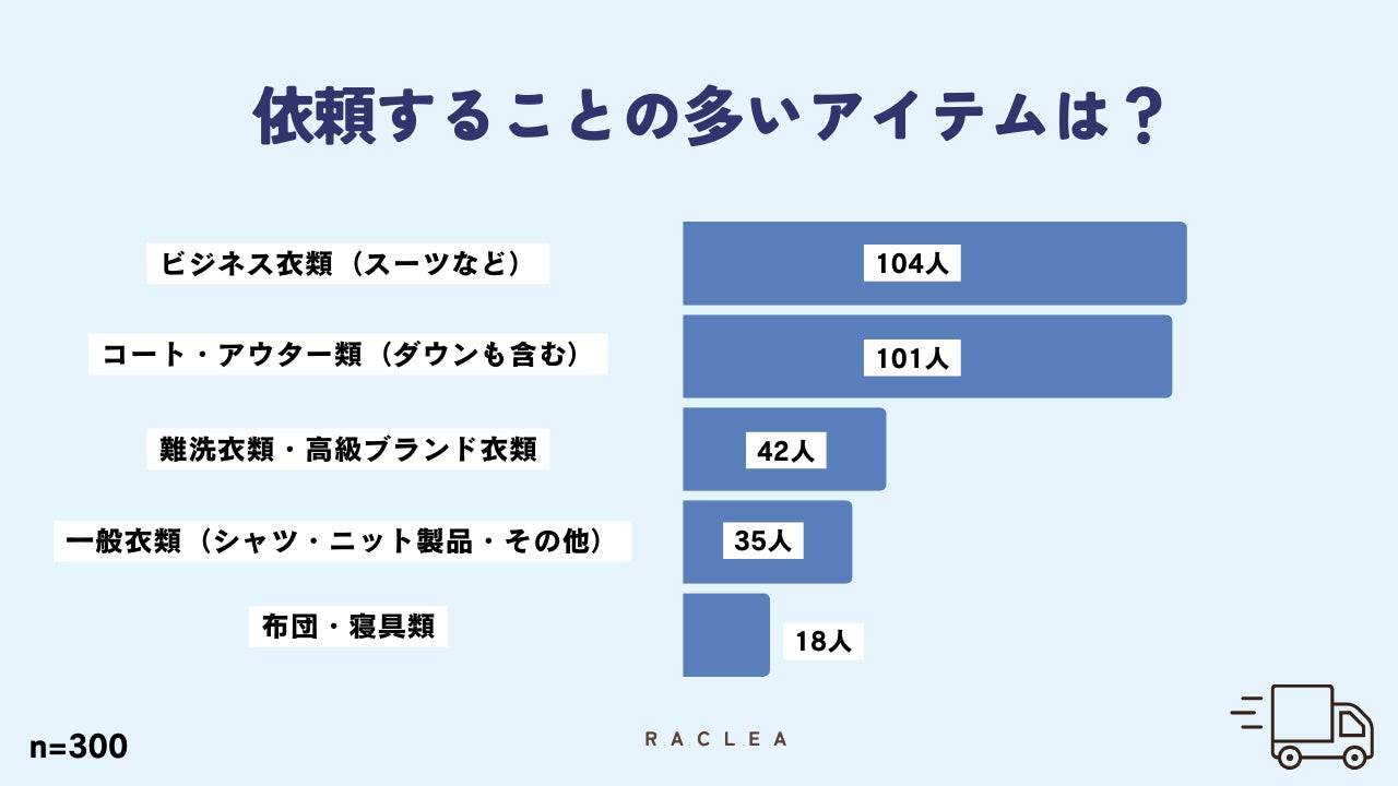 クリーニングサービスに依頼することが多いアイテムとしては、「ビジネス衣類(スーツなど)」が最も多く104人がこれを挙げています。次いで「コート・アウター類」が101人とほぼ同数です。