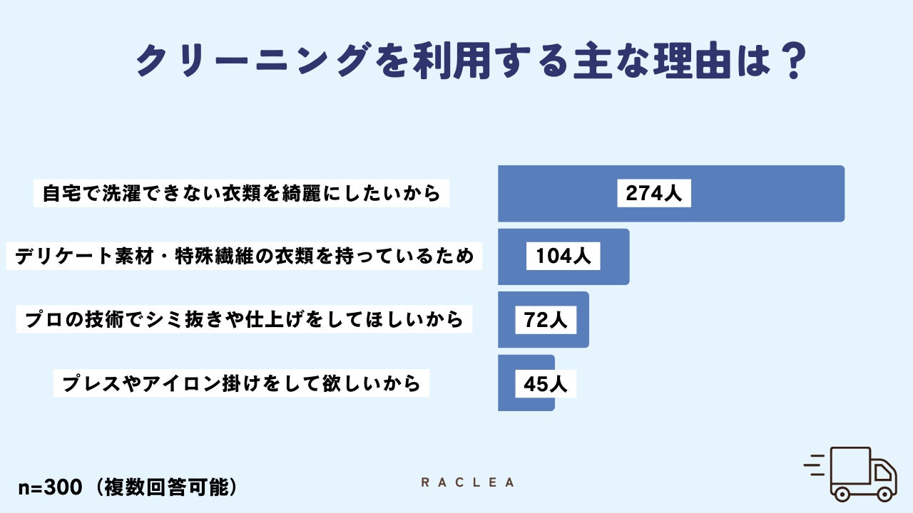 多くの人々がクリーニングサービスを利用する主な理由は、「自宅で洗濯できない衣類を綺麗にしたいから」という点であり、274人と圧倒的多数を占めています。