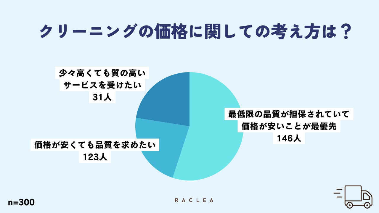 クリーニングの価格に対する考え方では、最も多い回答が「最低限の品質が担保されていて価格が安いことが最優先」で、146人と半数近くがこれを重視しています。