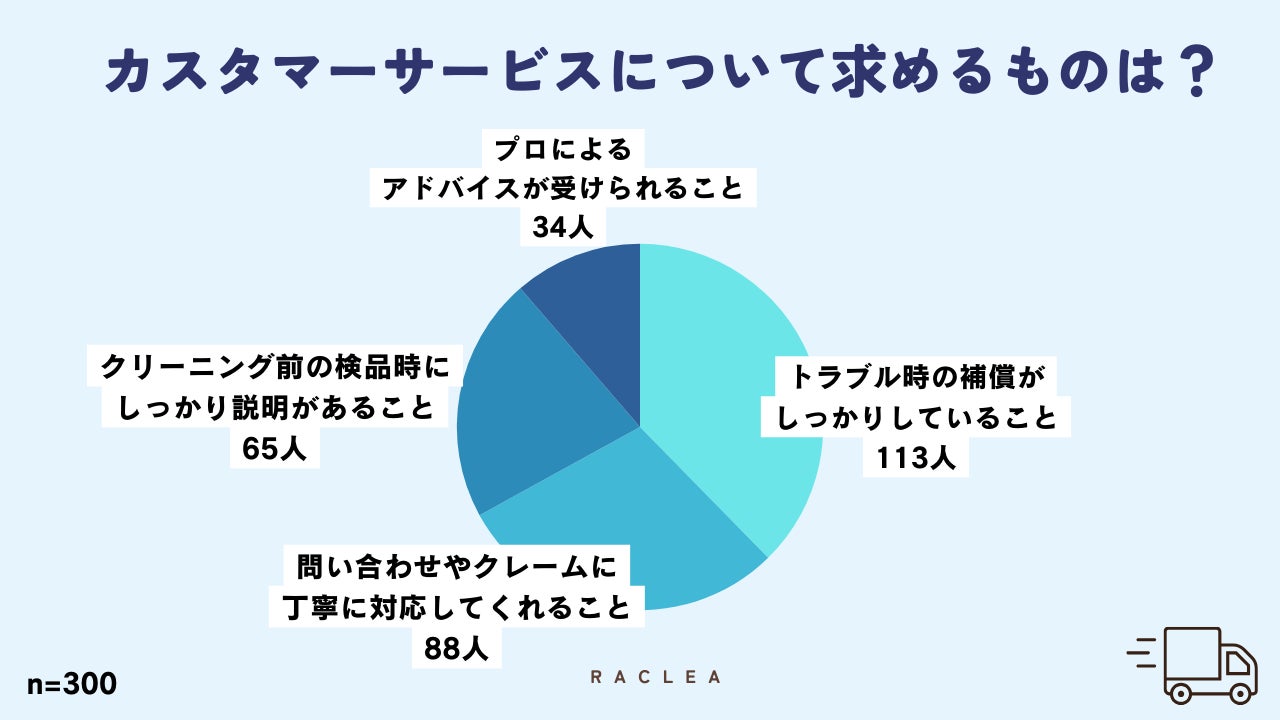 また、問い合わせやクレーム対応の丁寧さも88人が重視しており、コミュニケーションの質が重要視されています。クリーニング前の検品時の説明やプロのアドバイスも一定の需要があります。