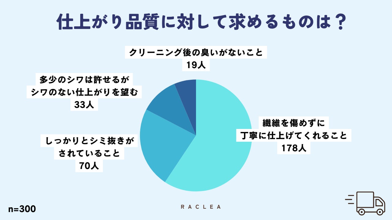 シワのない仕上がりやクリーニング後の臭いがないことを求める人も一定数いますが、優先順位は低めです。