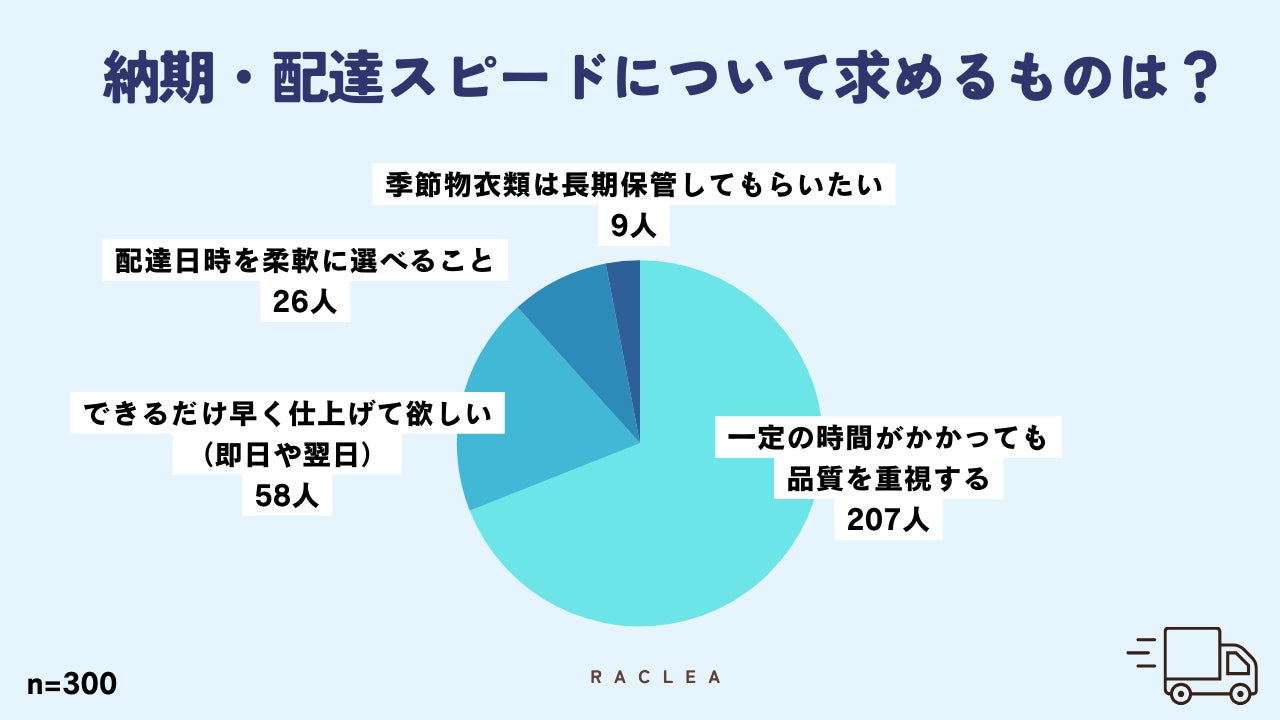 一方で「できるだけ早く仕上げて欲しい」とする人も一定数おり、スピードと品質のバランスが重要とされています。柔軟な配達日時や長期保管のニーズは少数派です。